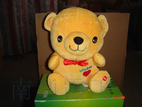 品名:愛心熊--艾曼 高度:26cm 顏色:黃 面料:超柔短絨 填充物:100%聚酯纖維 執(zhí)行標準:GB6675-2003 GB19865-2005 通過國家強制認證